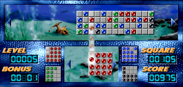 Довольно интересная игрушка, чем-то напоминающая Lines. В нижней половине поля располагаются 4 коробочки, три из которых нужно доверху заполнить жемчужинами, чтобы перейти на следующий уровень. Если же верхняя половина игрового поля, на которой находятся, так сказать, варианты установки шариков, заполняется, вы выходите из игры. Уже на следующем уровне задача усложняется, цвета шариков удваиваются и варианты их установки появляются быстрее. Рабочую коробочку можно поворачивать и устанавливать шарики в нужной вам проекции. Довольно занимательно.