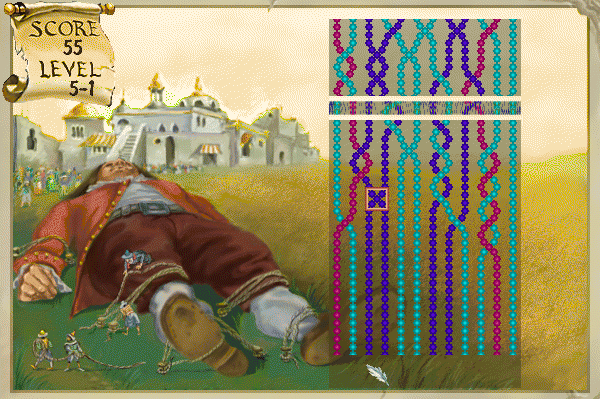 Задача играющего - убрать с экрана все веревочки. Веревочка исчезает, когда на ней развязываются все узелки. Стрелочками двигая курсор по узелкам, развязывайте их, нажимая пробел. И так пока не развяжете все до единого. Игру усложняет падающая планка, которая сдвигает все узлы на одну позицию вниз. Никак нельзя допустить, чтобы хоть один из них достиг нижней границы экрана.