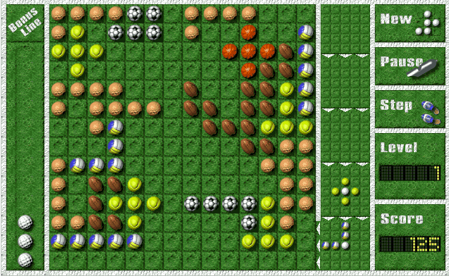 Если Fintry Flush только чем-то напоминает Lines, то Lineup практически полностью ее повторяет. Во всяком случае по смыслу. Разноцветные шарики заменили различные мячи, от баскетбольных и футбольных до мячей для игры в большой теннис и даже американский футбол. В правой части игрового поля располагается 5 ячеек, которые автоматически заполняются фигурами, представляющими из себя не что иное, как сочетания мячей одного типа. Один из мячей в фигуре белого цвета. Для размещения фигуры на игровом поле щелкните на том квадратике, где должен располагаться белый мяч. Остальные мячи должны занять свободные квадратики. Таким образом вам необходимо построить вертикальную или горизонтальную линию от одного края игрового поля до другого, причем состоящую из мячей одного типа. Как только вы это сделаете, линия "сгорает" и игра продолжается. Игра очень непростая, но вполне интересная. Хорошее дополнение к Lines, игра для настоящих интеллектуалов.